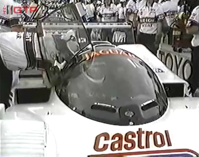 Cette photo est une capture d'écran d'une vidéo de l'IMSA GTP. On voit très bien les deux trous d'aération de la bulle. Par la suite l'aération sera assurée par un trou au niveau du sponsor Castrol. On constate également que la vitre permettant au pilote de se glisser dans le cockpit est désormais attachée au tube d'encadrement de la bulle. Encore une fois, est-ce un bricolage des mécaniciens ou une demande express des officiels de l'IMSA pour répondre au réglement ? Mystère. Il est vrai que l'astuce de l'équipe de Ross Brawn consistant à faire de la Jaguar XJR-14 un prototype sans portière avait de quoi surprendre.