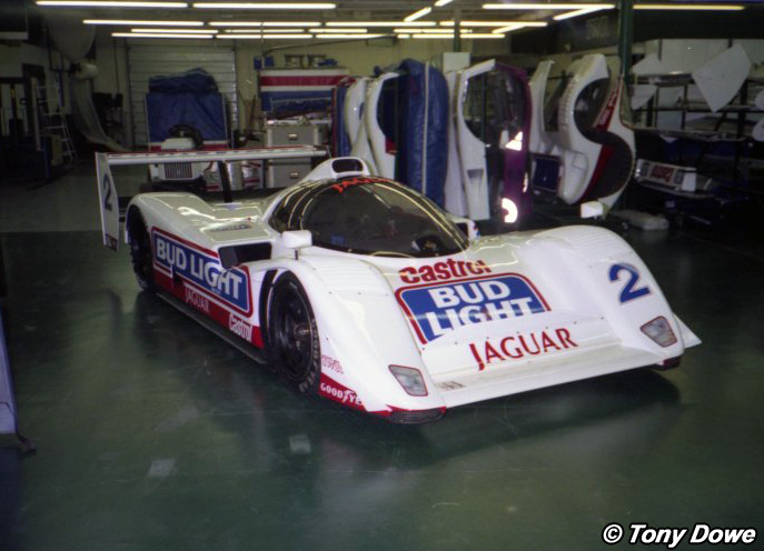 prise dans l'usine du TWR-Jaguar Racing à Valparaiso dans l'Indiana. Elle provient de la collection personnelle de Tony Dowe. La XJR-14/791 vient d'être repeinte en livrée Bud Light. Elle est encore en version SWC puisque l'on voit que la boite à air moteur est celle utilisée en 1991. Le réglement de l'IMSA demandera très rapidement une modification. On peut voir également un premier détail qui sera propre à la version GTP de la XJR-14 : les deux phares avant sont masqués par des stickers représentants des yeux. Je n'ai pas encore percé le mystère de ces stickers. Serait-ce une simple blague des mécaniciens puisque les phrases étaient jugés inutiles ?