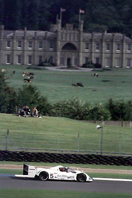 Cette photo a été prise dans les Craner curves. Alex Caffi est au volant. En arrière plan, on aperçoit le Donington Hall.