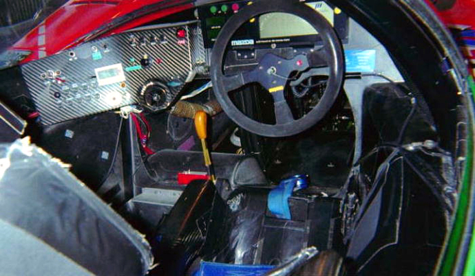 Voilà le bureau des pilotes ! Le levier de vitesse est identique à celui de la XJR-14. La plaque bleu à la droite du volant indique le numéro du châssis. Malheureusmenet on ne peut pas le lire. C'est probablement le 001.