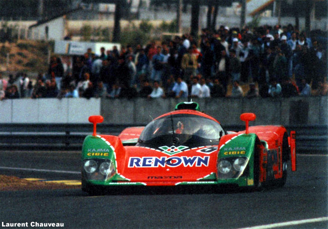 Cette photo très rare a été prise par Laurent Chauveau, fondateur du site Endurance-Info. Johnny Herbert franchit les esses de la forêt. L'équipage de la #5, géré par Oreca, teste la version "low downforce" de l'aileron arrière. Finalement, les pilotes et leur équipe technique ne retiendront pas cette configuration pour la course. Ils conserveront l'aileron arrière bi-plan. Comme cette photo n'a pas pu être prise en course, mais que le châssis est bien le 004 avec les grands rétroviseurs orange, cela signifique que Mazda a fait rouler les deux Renown #5 pendant les qualifications ou le Warm-Up.