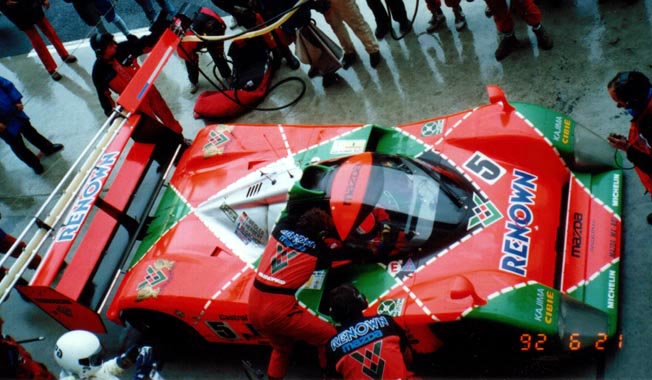 Cette photo a été prise lors d'un relai. Johnny Herbert s'installe au volant. La date semble indiquer qu'on est le dimanche 21 juin. Mais vu la pluie et la propreté de la voiture, je pense qu'il s'agit du samedi.