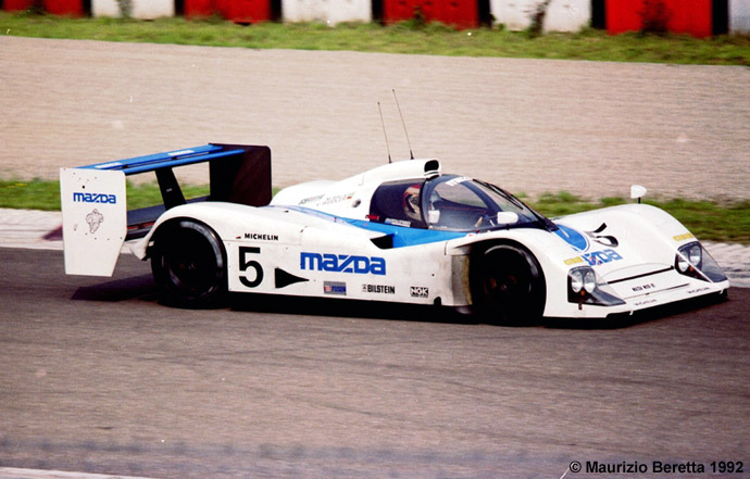 Cette photo a été prise par Maurizio Beretta, probablement dans les Lesmo. La prise d'air est droite. Outre les phares avant, on peut aussi voir aussi la différence des panneaux latéraux de l'aileron arrière par rapport à ceux de la XJR-14 de 1991. Le tunnel des radiateurs latéraux est également légérement plus refermé qu'en 1991, comme on peut le voir au dessus du second A du sticker Mazda.