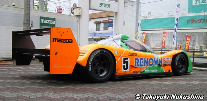 Cette photo a été prise en 2001 par Takayuki Nukushina dans la cour du concessionnaire Efini Mazda de Yamaguchi. J'ai longtemps pensé que cette Mazda MXR-01 était probablement le châssis 004 qui a terminé 4ème des 24 Heures du Mans 1992. En effet ce n'était pas le châssis qui avait fait le championnat JSPC. La couleur orange était passée au soleil, suggérant qu'il s'agissait bien d'un châssis authentique mais non restauré. Il a des grands rétroviseurs oranges, comme le 004 de course. En regardant de plus près et avec le recul des années, je pense qu'il doit plutôt s'agir du châssis 002. Sur cette photo prise de l'arrière, on voit qu'il manque le nom du 4e pilote Maurizio Sandro-Sala, qui a remplacé Bertrand Gachot en fin de course. Sur le châssis 004, son nom avait été ajouté.