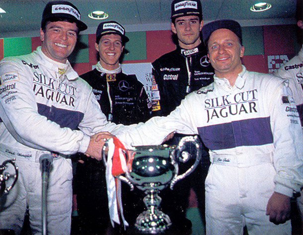 Photo du nouveau Champion du Monde Fabi serrant la main de son dauphin Warwick. En arrière plan, Schumacher et Wendlinger, vainqueurs de la dernière manche de la saison 1991.