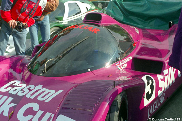 Cette photo a été prise par Duncan Curtis lors du pesage des Jacobins. Elle présente un intérêt pour les maquettistes : la présence unique du nom de Kenny Acheson et le sticker Jaguar rouge en par-soleil. Il avait été vu aux essais de Suzuka mais avait très vite été remplacé en course par un sticker jaune fluo. Au niveau de laération du cockpit, les ouvertures dans le pare-brise n'apparaissent plus mais on voit encore les ventilateurs.