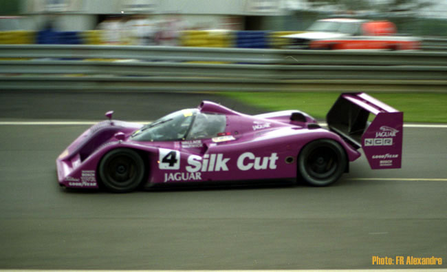 Cette photo a été prise par François-René Alexandre à l'entrée des esses de la forêt. Le sticker autocollant indiquant la catégorie de la voiture a été posé par les commissaires de l'ACO au niveau du loquet rouge permettant d'ouvrir la fenêtre de la XJR-14.