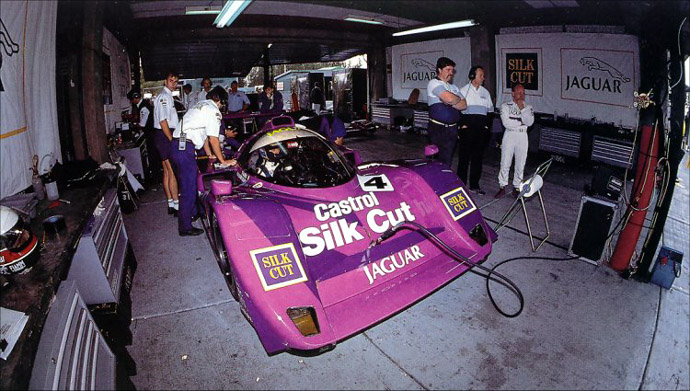 David Brabham au volant, Teo Fabi à l'écran. Cette photo semble avoir été prise durant la première journée des essais. Car la XJR-14 est encore en configuration Magny-Cours. Le kit aéro est complet et les persiennes sont retirées.