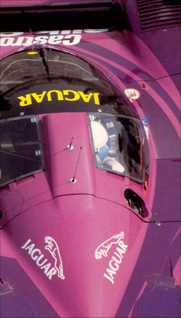 Cette photo prise depuis les loges au dessus des stands permet de voir que Jaguar avait quasiment fermé les ouvertures de refroidissement des freins arrières. Par rapport à l'ouverture triangulaire d'origine, des plaques avaient été posées dès Magny-Cours pour en réduire la taille. Ici, on voit un rajout, peut-être un simple scotch violet. Les capteurs télémétriques devaient indiquer une température trop basse. On notera d'ailleurs que la Mazda MXR-01 de 1992, qui était en réalité le projet XJR-14B, avait des ouvertures bien plus petites.