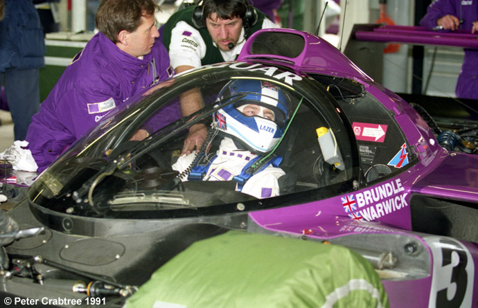 Cette photo a été prise pendant les essais par Peter Crabtree dans le stand Jaguar. On distingue les deux ouvertures d'aération faites dans la bulle de part et d'autre de l'essuie-glace. TWR a également ajouté des ventilateurs.