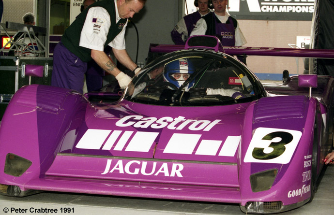 Cette photo a été prise pendant les essais par Peter Crabtree dans le stand Jaguar. Derek Warwick est prêt à l'élancer. Des scotchs noirs ont été posés sur les entrées de refroidissement des freins avant. Il y en a également sur les écopes de frein arrière.