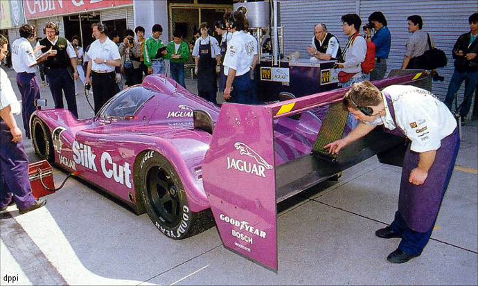 Cette photo a été prise dans la voie des stands de Suzuka. A noter les stickers carrés jaune fluo sous l'aileron arrière. On ne voit pas souvent ce détail pour maquettistes. On voit également le rechargement de la batterie par un branchement sur le flan gauche de la Jaguar. A Suzuka, la sortie d'échappement était très basse. Elle sera rehaussée dès la course de Monza.