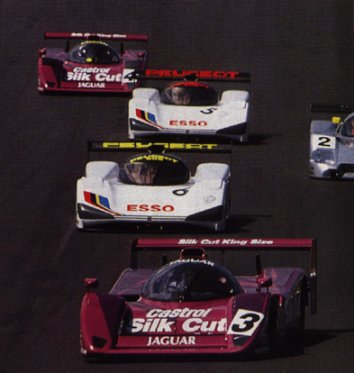 Cette photo a été prise au départ de la course. Derek Warwick devance les deux Peugeot 905 et la Mercedes C291.